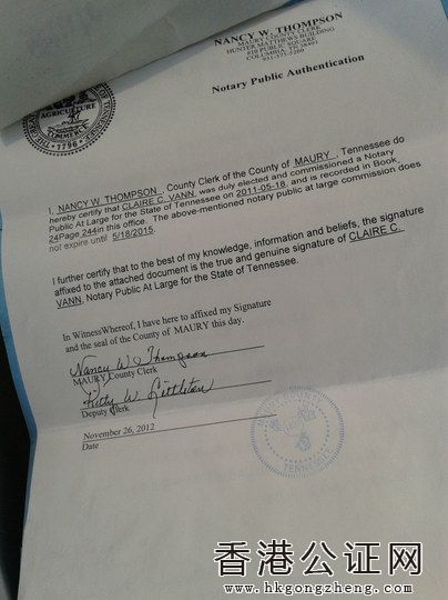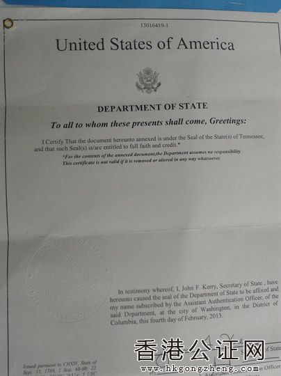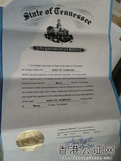 順序?yàn)椋?、美國國務(wù)院文件,國務(wù)院蓋章、官員簽字;2、美國國務(wù)院印章;3、中國駐美大使館官員認(rèn)證;4、美國田納西州州政府蓋章、副國務(wù)卿簽字;5、苗里郡政府蓋章、官員簽字。